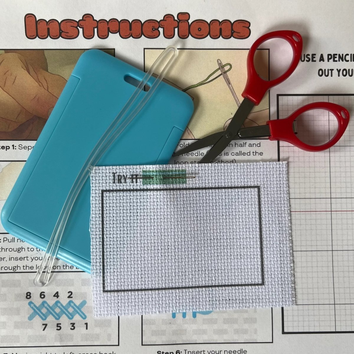 • 5 premium embroidery floss colors- (black, pink, purple, and light blue)