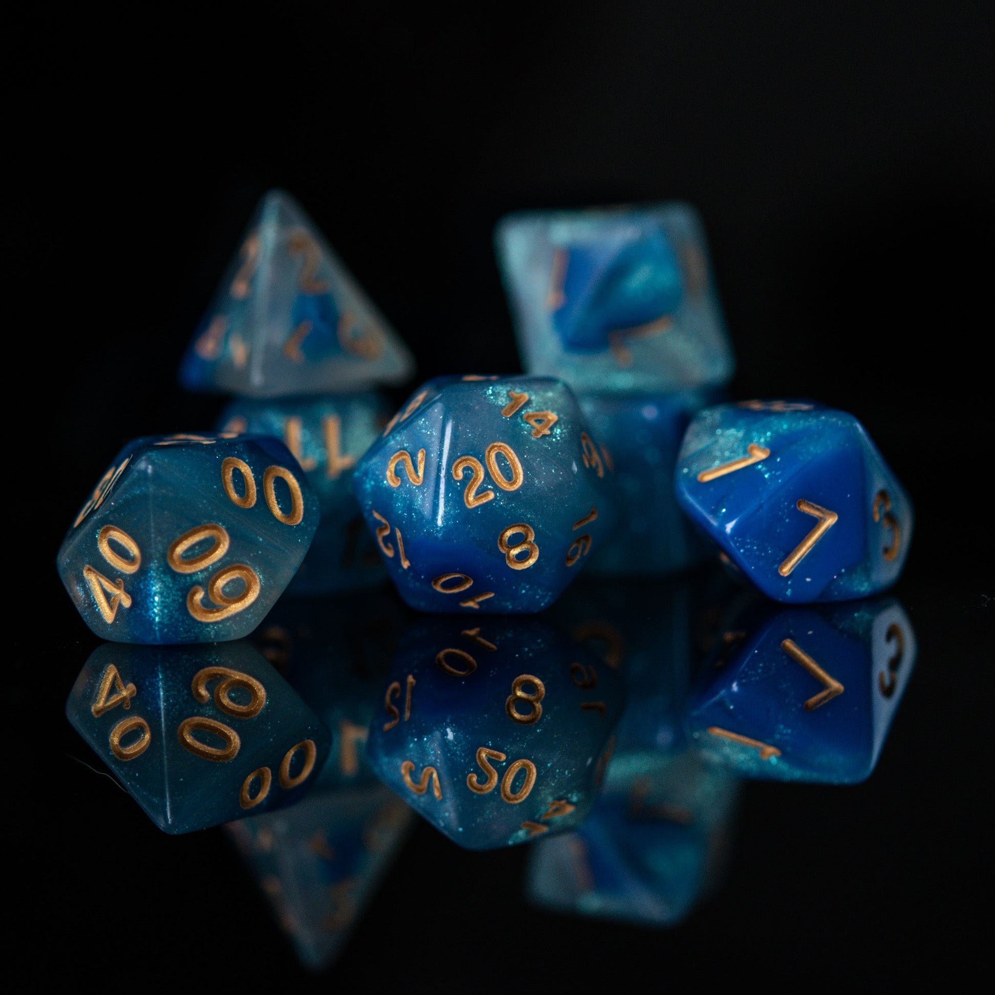 Our acrylic dice are carefully poured into individual molds and cured inside a vacuum chamber to insure no air bubbles are trapped inside the dice. After curing, each individual die is removed from the mold and numbers are painted by hand. These dice are perfect for any RPG and will sure to impress at your upcoming session!