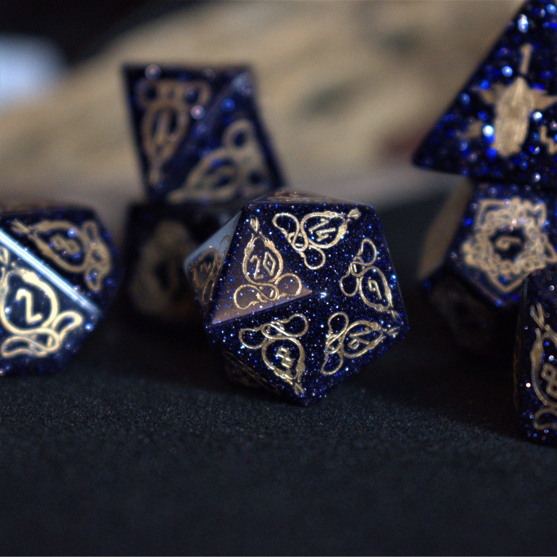 Each die is hand carved from pure gemstone and polished in a proper tumbler. Designs are then engraved into each side and hand painted. Gemstone dice are never guaranteed to have a perfectly balanced weight; however, each of our dice sets are always well weighted and well balanced.