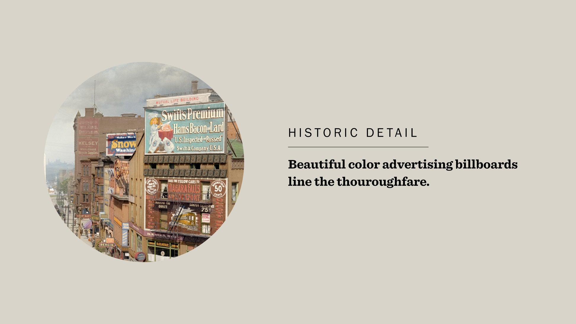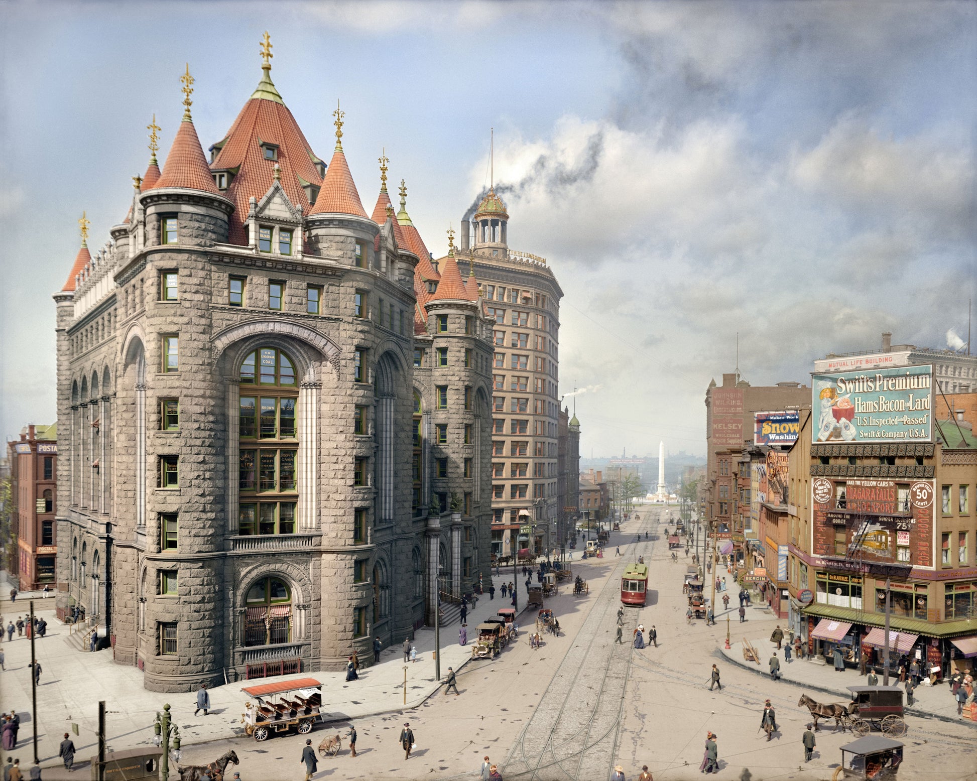 A bustling Niagara Street in Downtown Buffalo, New York, circa 1908. The McKinley Memorial Monument, dedicated in 1907, can be seen in the background. Library of Congress, LC-D4-70294